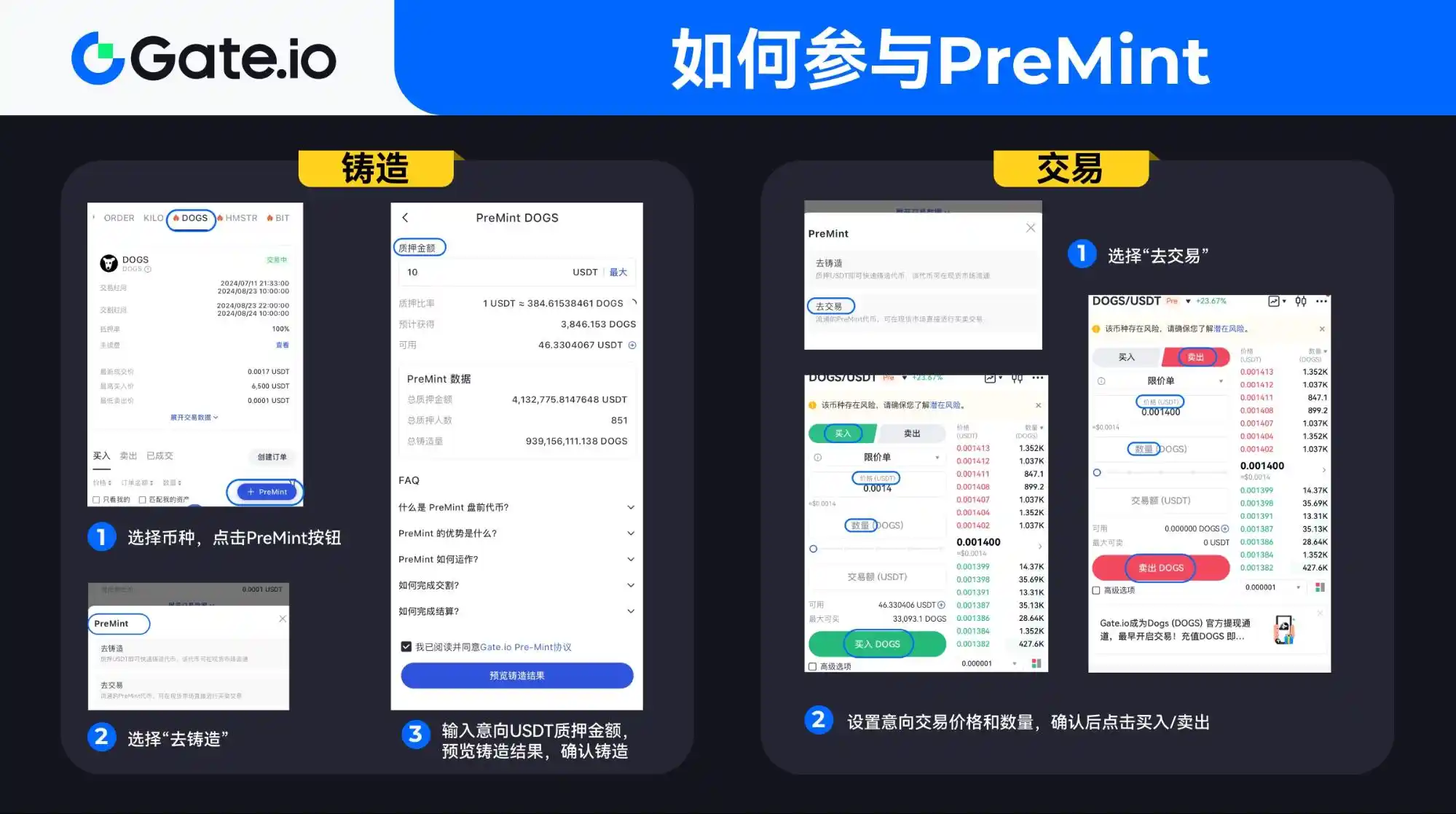 首先,访问 Gate 官网并选择盘前交易,选择 DOGS 币种后点击 PreMint 按钮。在弹出的 PreMint 窗口中,选择「去铸造」。接着,在信息弹窗中输入计划质押的 USDT 金额,预览铸造结果,确认无误后点击确认铸造。