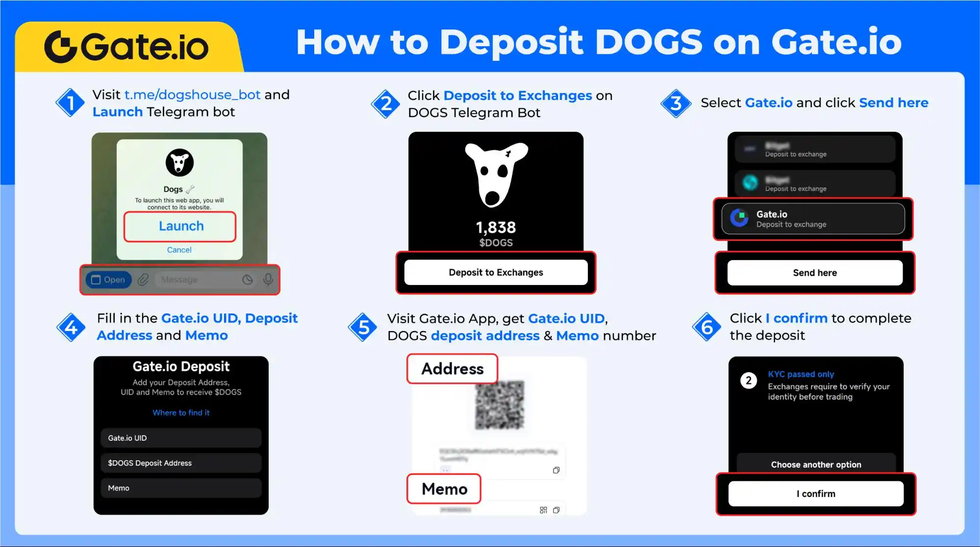 作为 DOGS 项目的官方充值平台,Gate 现已支持 DOGS 代币的充值服务。用户可以通过DOGS 电报机器人点击「充值到交易所」,选择「Gate」点击 Send 按钮,填写 Gate UID、充值地址和 Memo。访问 Gate App 获取以上 Gate UID、充值地址和 Memo 后,点击确认即完成充值。