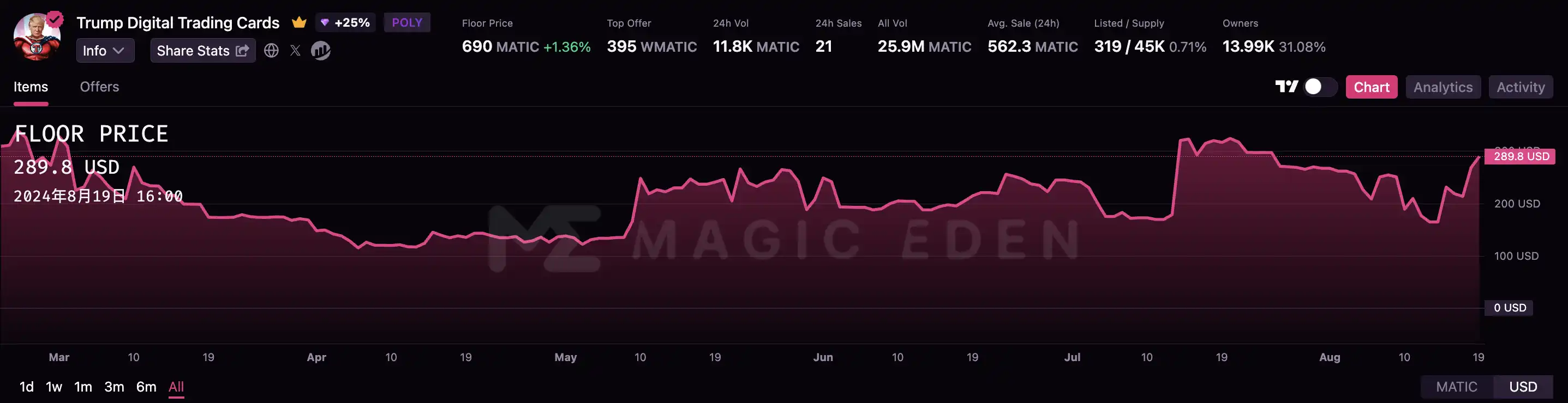 根据特朗普此次财务披露,除了其申报持有价值 100 万至 500 万美元之间的基于以太坊的加密资产之外,特朗普还从三个 NFT 系列中赚取了超过 715 万美元。此外,特朗普的妻子也通过销售数字交易卡或 NFT 手续费赚取了超过 33 万美元。特朗普在 7 月表示,他计划发布另一套 NFT 系列。