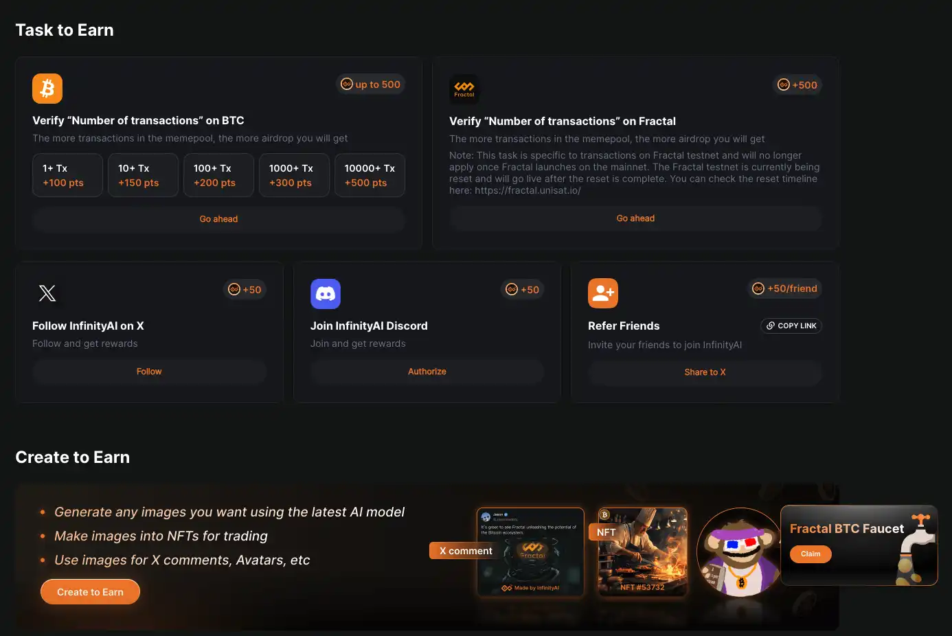 InfinityAI 是目前 Fractal Bitcoin 上非常火热的项目之一,前文提到过官网可以领水,也有很多测试任务可以做。
