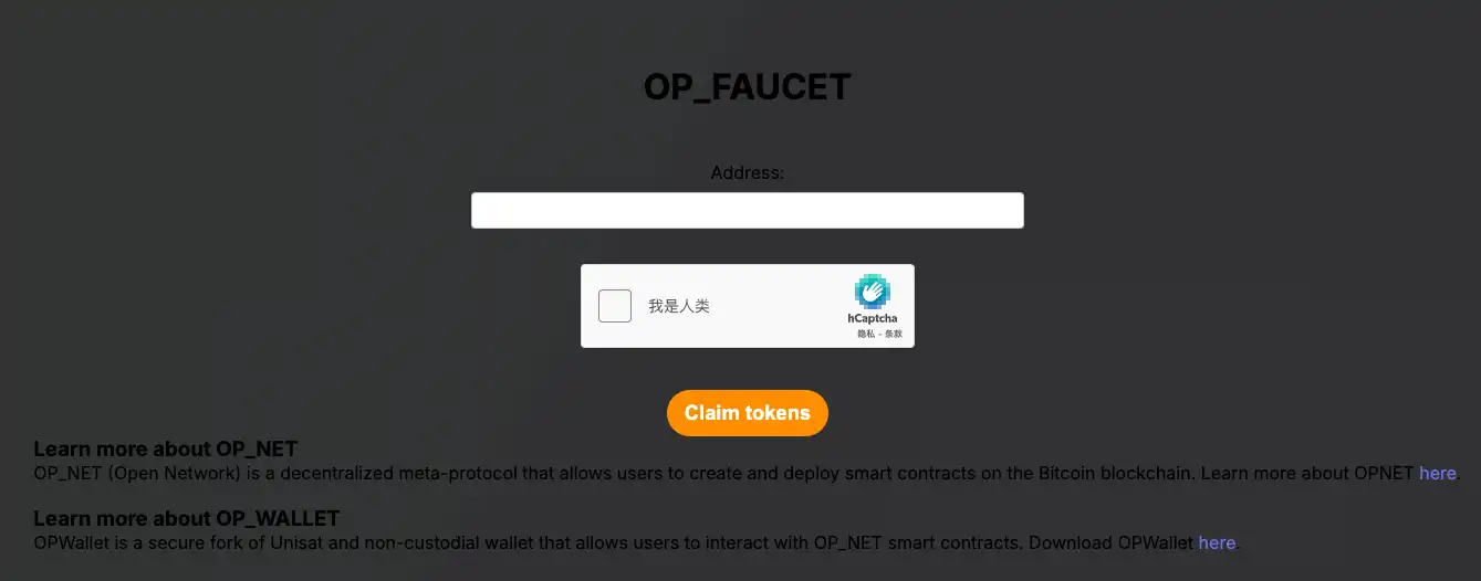 2、OP_NET 水龙头:访问链接,另一个可用于领取测试网代币的水龙头,适用于测试 Fractal Bitcoin 的生态系统。输入地址,在完成人机测试后即可领水(该渠道有时会失效)