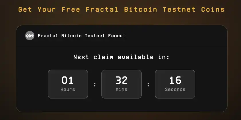 1、 Fractal 网络官方水龙头:访问链接,这是 Fractal Bitcoin 官方提供的水龙头网站,用户可以在此免费领取测试网代币,如图页面会显示下一次可以领水的时间。