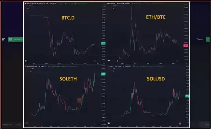 他介绍了与 Ledger 的讨论,并展示了四张图表:比特币主导率、ETH/BTC 比率、ETH/Solana 比率以及 Solana/USD 价格。他认为这些图表能反映市场的当前状态,旨在获取 Ledger 的解读。