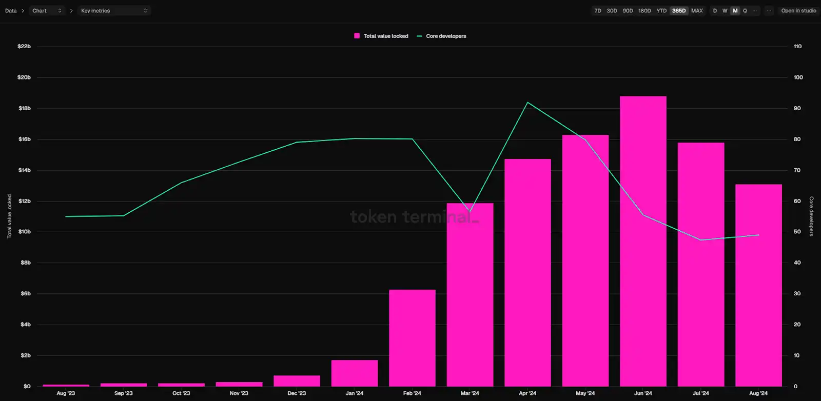 截至 2024 年 8 月 21 日,多链 DeFi 的总锁定价值(TVL)已降至 84.6 亿美元。这一数字较 2021 年 12 月创下的历史峰值 186.8 亿美元下降了 54.7%,仅比 Luna 事件引发的市场动荡后的水平高出 61%。这种显著的下降趋势,部分可以归因于资产整合的普遍减少,例如以太坊和比特币的封装资产等,同时,资本外流的压缩也对这一下降趋势有所贡献。