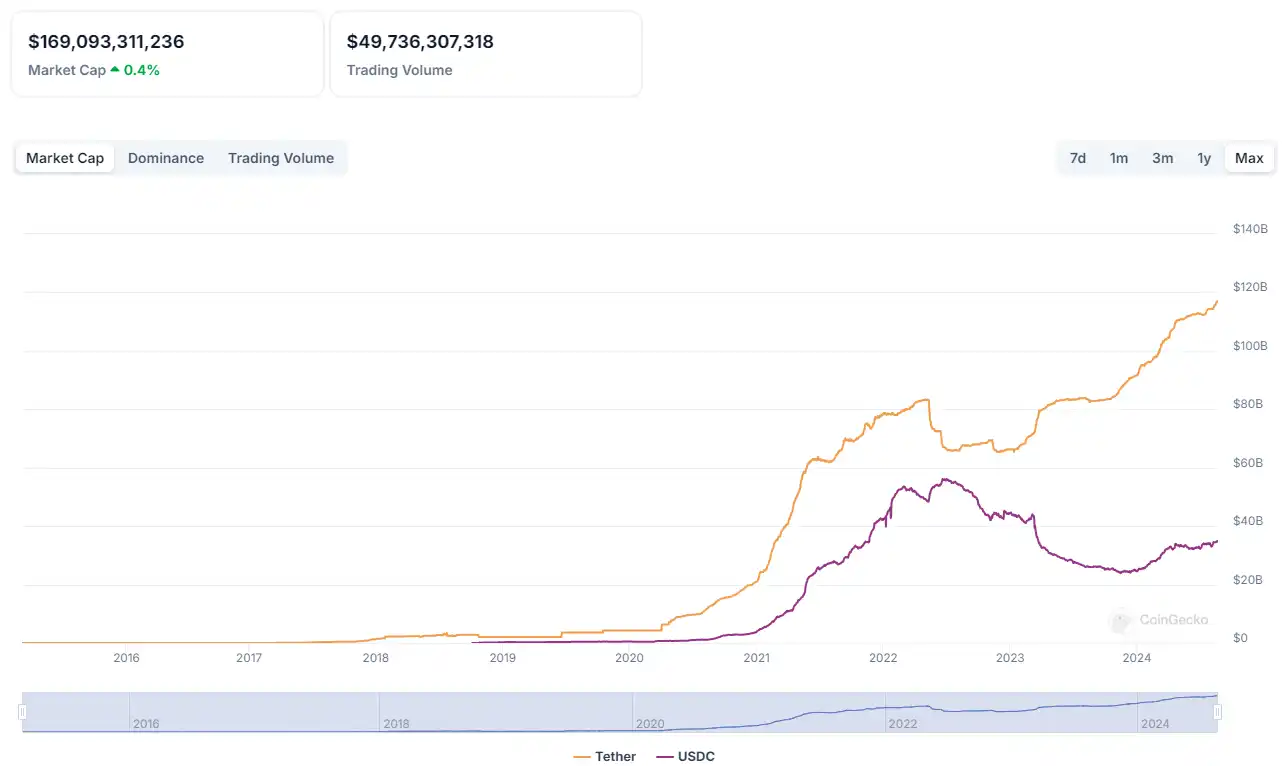 目前稳定币市值为$169B,在全球范围内获得了广泛关注和应用,逐渐从加密货币交易的狭义场景扩展为全球化支付的重要选择。