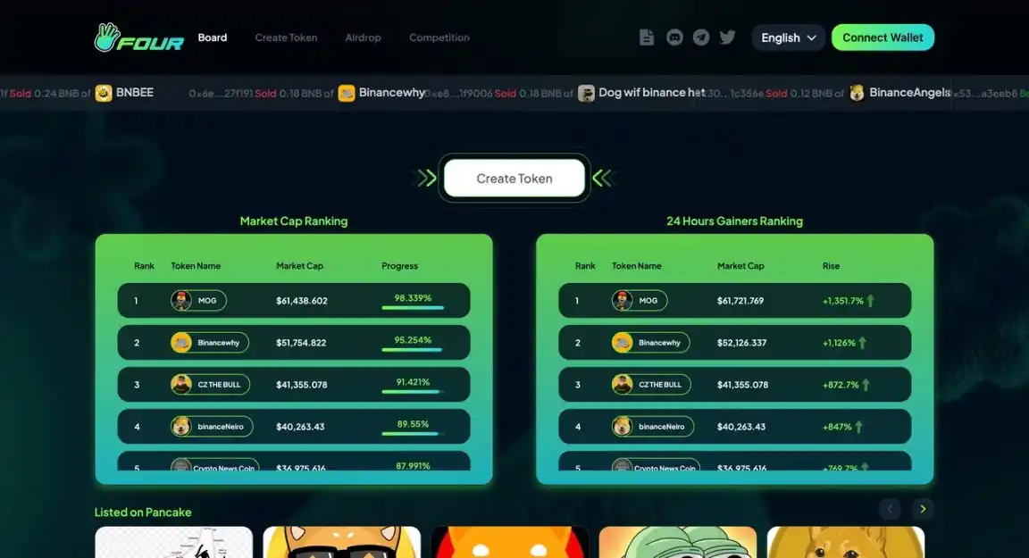 Four.meme 作为 BNB 链上的发行平台,从项目名称到品牌 LOGO 都能看出与 BNB 的关联,其化用了 CZ 的经典手势「Four」。此外,4chan 作为 Memecoin 在 Web 2 的发酵平台或许也影响了 Four.meme 的品牌名。不论是从团队创始人发言还是各类活动来看,Four.meme 都获得了 BNB Chain 不小的助力。其与 FOUR 代币合作推出空投活动,用户在平台指定页面完成相关任务即可获得积分,积分可兑换 BNB Chain 生态 Meme 币 FOUR 和 WHY。该活动获得 BNB Chain 支持和转发,受此消息影响,FOUR 在 24H 涨幅超 65%。8 月中,Four.Meme 开始举办 Meme 创建大赛,总奖池包括 100 万个 Four.Meme 积分和价值 2 万美元的 Meme 代币,邀请到了 In2Ventures 创办人 Bili、NBA 明星 Tristan Thompson 、WHY、FOUR 团队,作为裁判嘉宾。