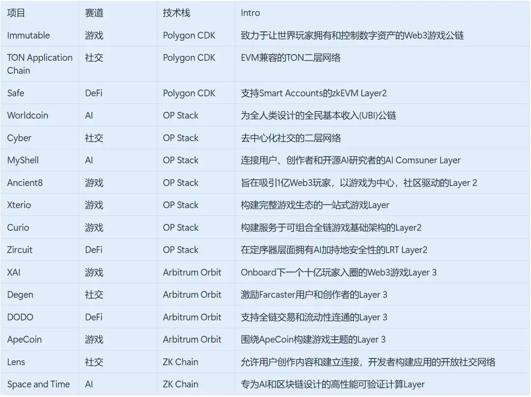 在 2023 年和 2024 年,越来越多的 dApps 宣布转型为应用链。针对这一现象,我们统计了整个应用链赛道,发现这些应用链主要集中在 DeFi、游戏、社交和 AI 等领域。我们认为,应用链的发展已成为必然趋势,这是由于模块化技术的成熟、通用 Rollup 二层网络的广泛验证、RaaS 平台的增多和服务的完善,以及 dApps 对公链区块空间资源竞争、终端用户交易成本优化和代币经济定制化需求的推动。
