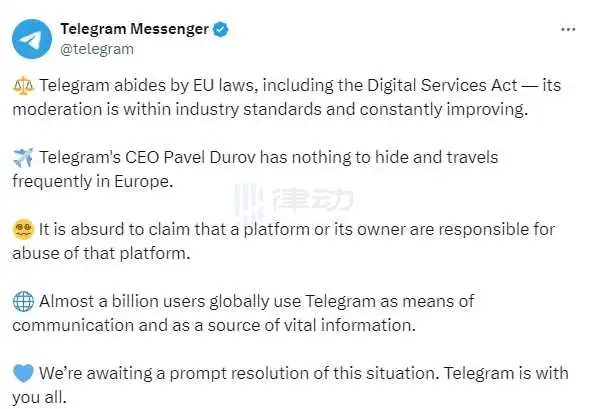 Telegram回应CEO被捕:Telegram遵守欧盟法律,审核符合行业标准并不断改进