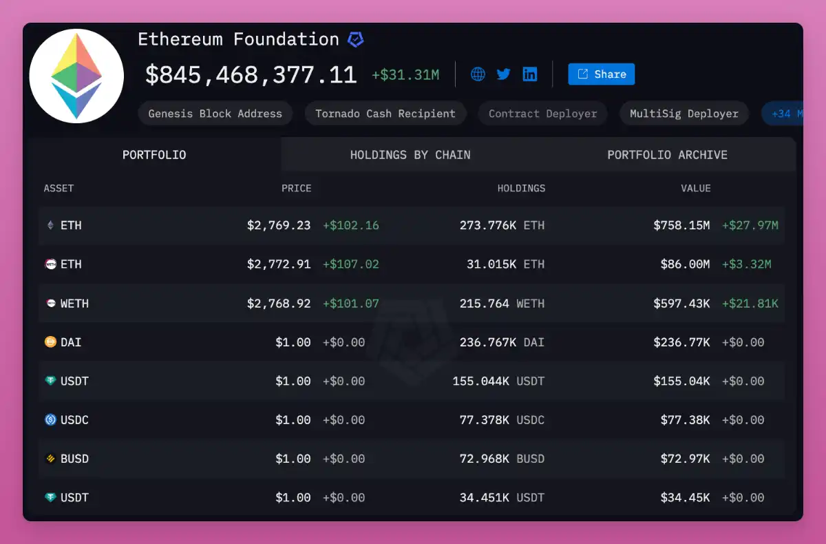 以太坊基金会持有价值 8.45 亿美元的 ETH,占 ETH 总供应量的 0.25%。