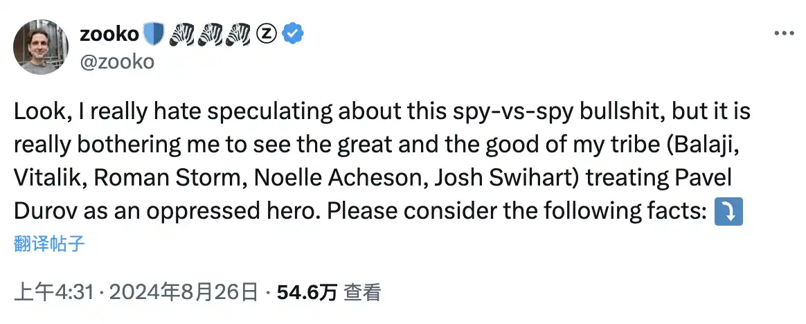 或许是在「隐私问题」上有着自己独特的见解,隐私加密货币 Zcash 的创始人对 Pavel Durov 的被捕事件发表了截然不同的看法,他对许多人将 Durov 视为受压迫的英雄表示不满,指出 Telegram 平台存在严重的问题,并质疑 Durov 的动机和 Telegram 的真正目的。