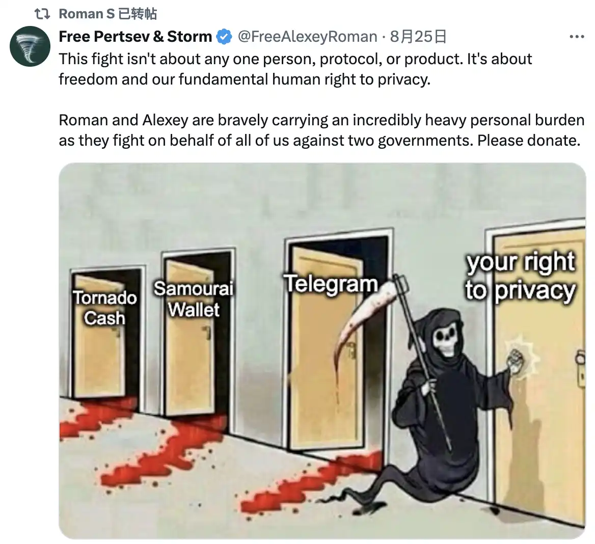 在 Pavel Durov 因 Telegram 的隐私和加密功能在法国被捕后,Roman Storm 的推特也转发了多条声援的信息。
