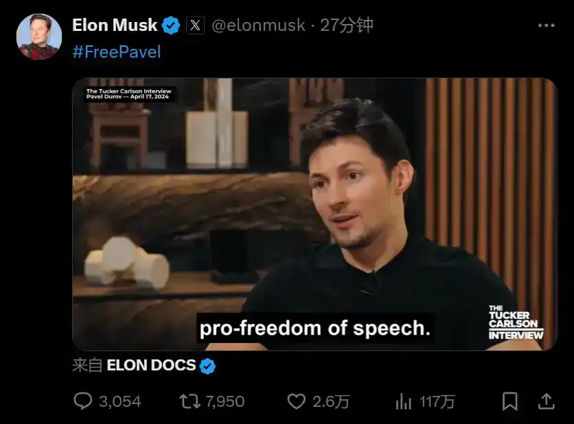 在 Pavel Durov 被捕后,马斯克多次在在社交媒体上附带 #FreePavel 标签声援 Pavel Durov,在他发布的一段视频视频中,Pavel Durov 曾表示,「马斯克收购 X 使得言论更加自由,这是伟大的进步,人类需要更多像 X 和 Telegram 这样维护言论自由的社交媒体。」