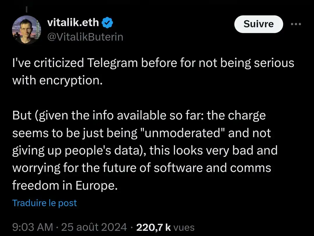 以太坊创始人 Vitalik Buterin 也对 Durov 的被捕表达了关切。作为一位也放弃了俄罗斯身份的科技领袖,Vitalik 对 Telegram 的加密实践曾有批评,但在当前局势下,他更担忧的是欧洲软件和通信自由的未来。