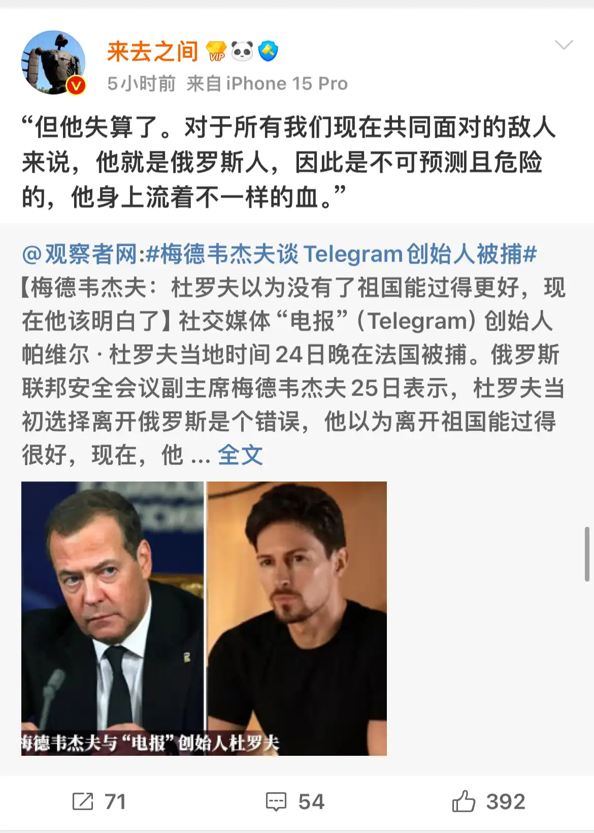 梅德韦杰夫的话可能没有影响到 Pavel Durov,但似乎引起了微博 CEO 王高飞的共鸣,王高飞在微博上引用了这段「在共同的敌人看来,Pavel Durov 就是俄罗斯人」的内容。
