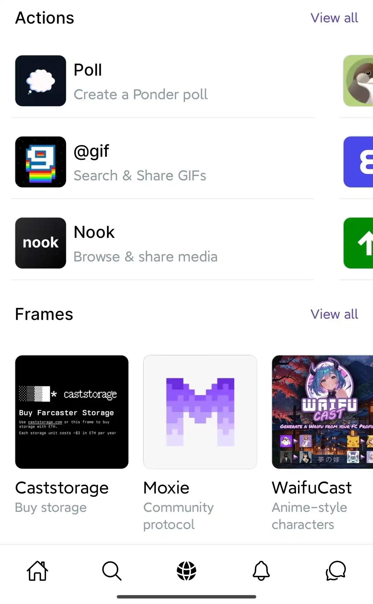 手机端还能看到官方推荐的 Frames、Actions,以及一些集成了 Farcaster 的 APP: