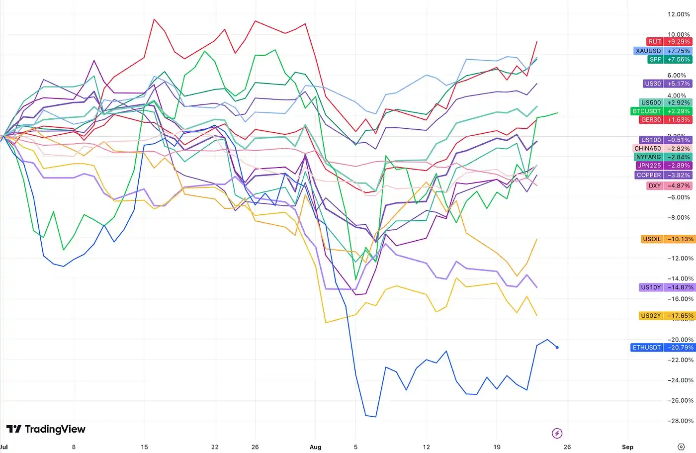 周五的杰克逊霍尔会议,美联储主席鲍威尔做出了迄今为止最明确的降息声明,9 月降息已成定局,他还表示不希望进一步冷却劳动力市场,且对通胀回到 2% 的路径上的信心增强。但他依旧坚持政策放松的速度将取决于未来的数据表现。