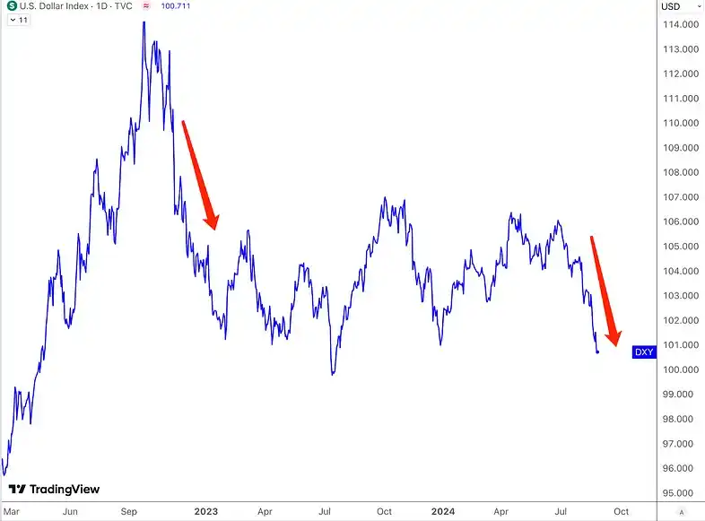 过去一个月,美元指数(DXY)已下跌 3.5%,为 2022 年底以来最快的下跌速度,这与市场对美联储降息预期增强有关。