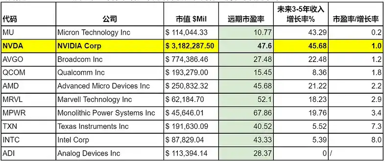 NVDA 和竞争对手对比下市盈率绝对不低,已经达到了 47.6 倍,但是由于仍然保持了较高的增长预期,所以所谓的 PEG ratio 也就是市盈率除以增长率的结果仍然在同行里属于最低的水平之一: