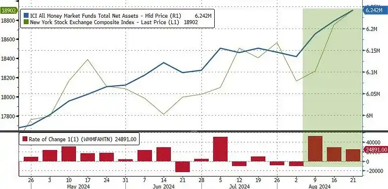 尽管全球股市回暖 资金流入,低风险偏好的货币基金市场也连续四周流入,总规模升至 6.24 万亿美元,再刷历史新高,可见市场流动性依旧非常充裕: