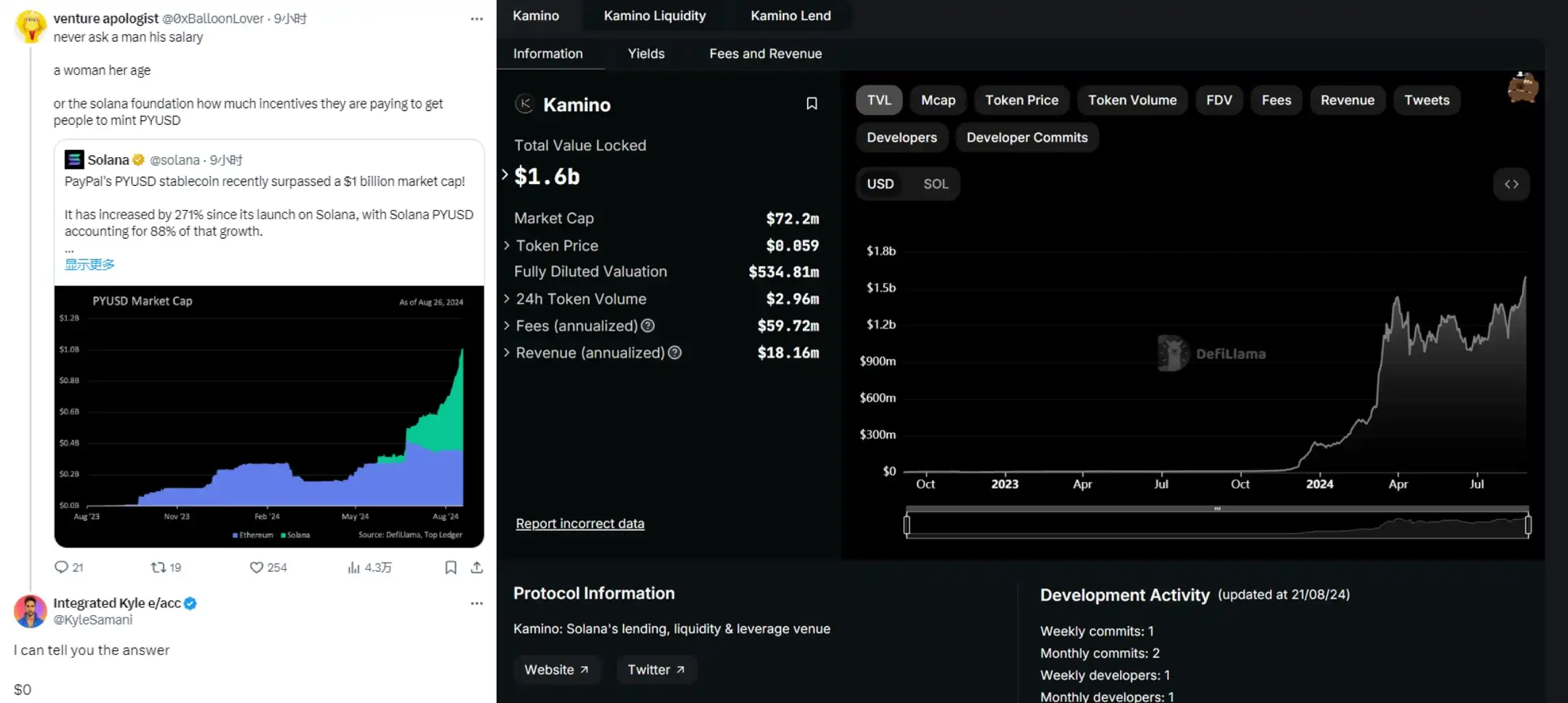 而如此之高的稳定币年化,利息来源是哪里?也不禁让人质疑,PYUSD 是否能够在没有目前提供的激励措施的情况下持续增长。对此,有 KOL @0xBalloonLover 发出疑问「永远不知道,Solana 基金会支付了多少奖励来鼓励人们铸造 PYUSD。」出乎意料的是,或许这些奖励并不是来自 Solana 基金会。在该 KOL 的推文下,Multicoin Capital 的管理合伙人 Kyle Samani 以及 Solana 社区的核心成员、Helius 创始人 Mert 都表示,Solana 基金会其实一分未出。
