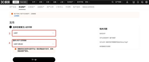 2、选择您需要充入的币种【USDT】—选择USDT可用的充币网络【USDT-ERC20/USDT-TRC20/USDT-OKTC】—【下一步】;注意:选择充值USDT币种时,此地址只能充入Tether - USDT,请勿充入其他币种,否则您充入的资产将无法找回。