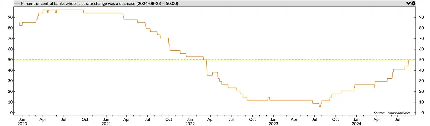 1. 全球央行,尤其是美联储,正在降低资金成本。美联储在通胀高于其目标时仍在进行降息,而美国经济持续增长。英格兰银行(BOE)和欧洲中央银行(ECB)可能会在即将召开的会议上进一步降息。