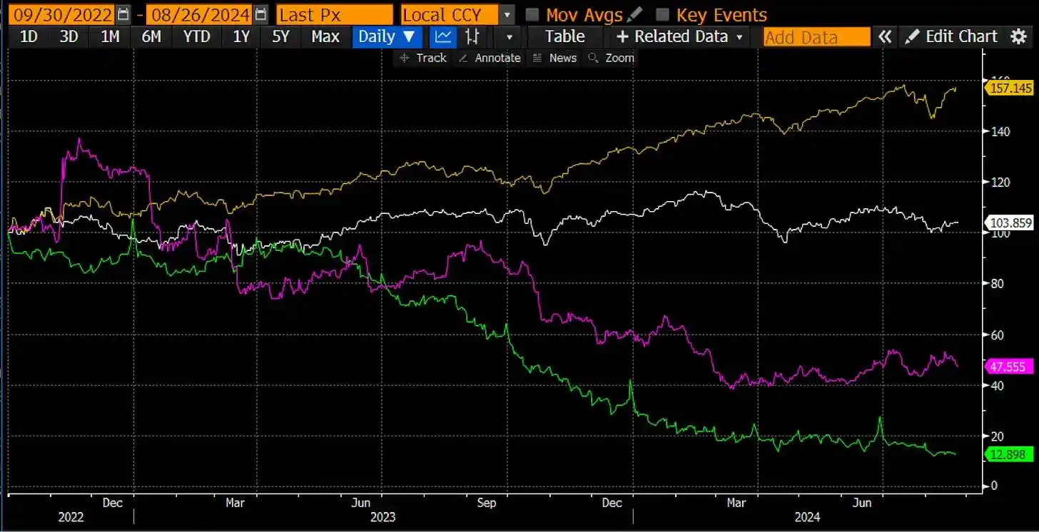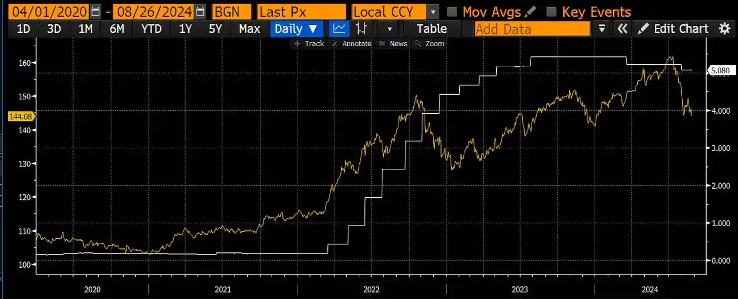 上面的图表显示了美元/日元汇率(黄色)与美元-日元利率差(白色)的对比。利率差是美联储有效基金利率减去日本银行的隔夜存款利率。当美元/日元上升时,日元贬值,美元升值;当其下降时,情况正好相反。在美联储于 2022 年 3 月开始收紧货币政策时,日元大幅贬值。今年 7 月,日元贬值达到了历史最高,当时利率差达到了最宽。