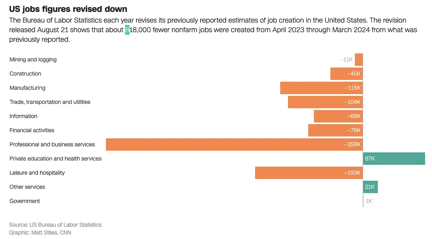 鲍威尔基于一份糟糕的就业报告做出了调整。美国总统拜登的劳工部 (BLS) 在鲍威尔于杰克逊霍尔发表演讲的几天前,发布了对先前就业数据的令人震惊的修正,指出就业估计值高出了大约 80 万。