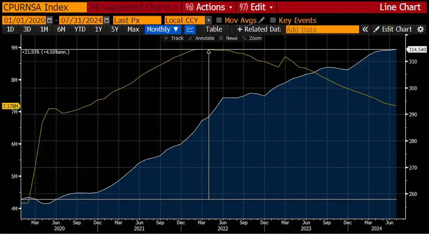 自 2020 年以来,被操纵的美国消费者物价指数(白色)上涨了 22%。美联储的资产负债表(黄色)增加了超过 3 万亿美元。