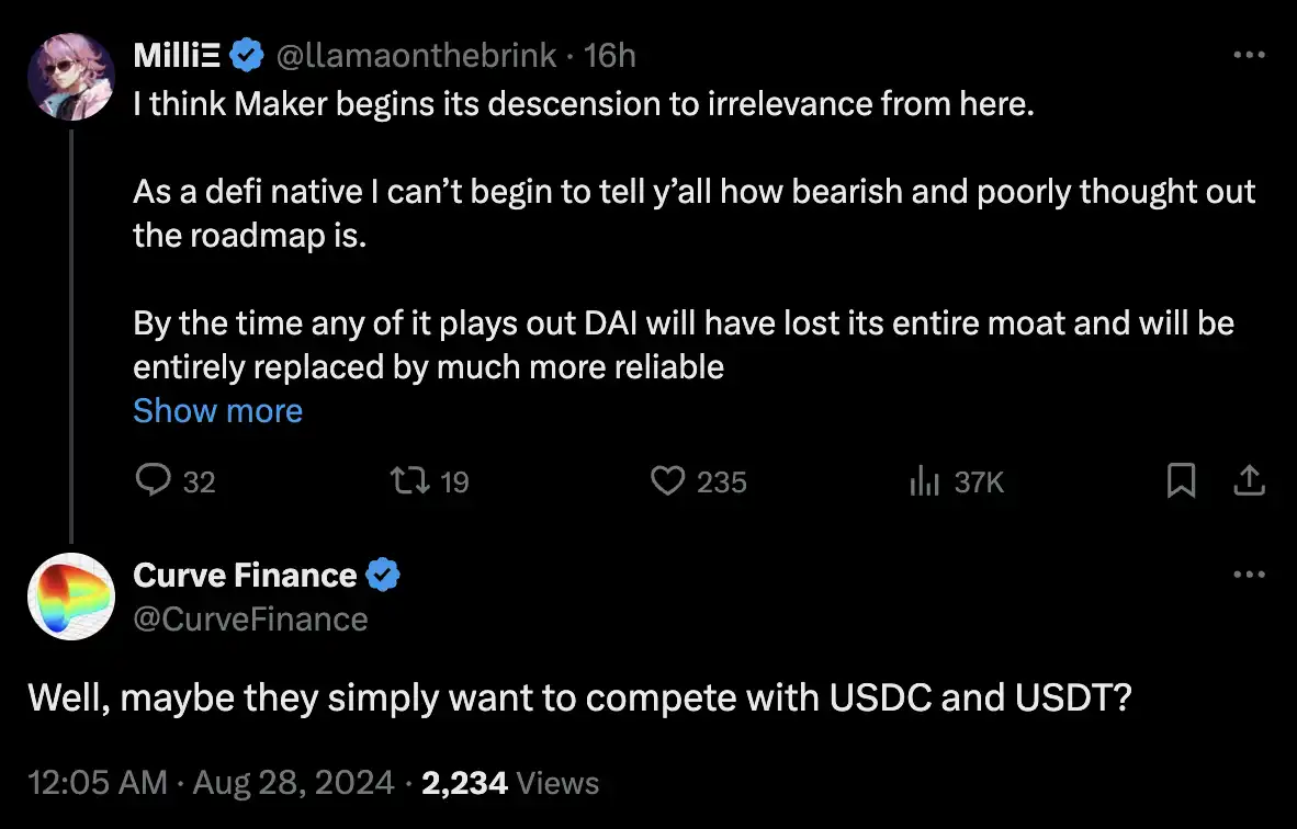 Synthetix 成员MilliΞ评论称「我认为,从这里开始 Maker 将逐渐变得无关紧要。作为一名 DeFi 原住民,我无法形容这个路线图是多么悲观且欠缺深思熟虑。等到这些计划真正实施时,DAI 将失去其所有的护城河,完全被更可靠的替代品取代(在这种情况下,甚至像 USDC 这样的东西都更好)。」
