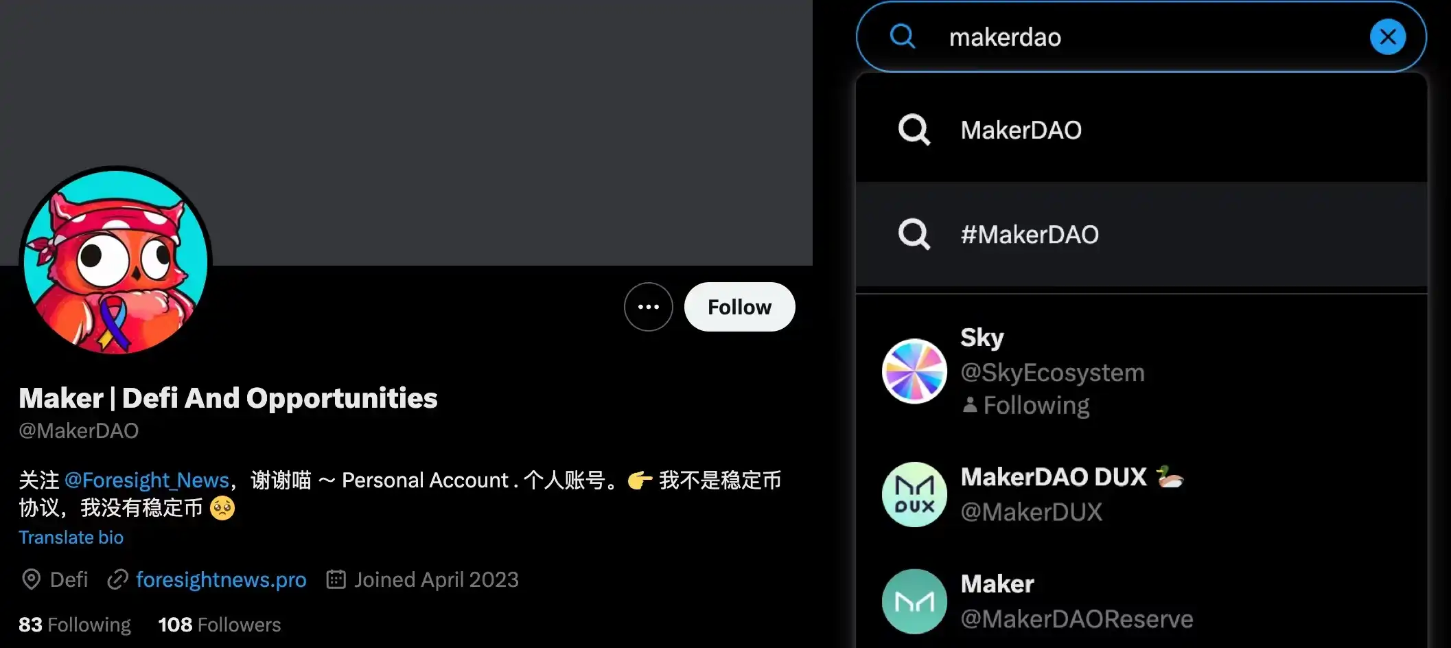 昨晚,MakerDAO 官宣正式更名为 Sky Protocol 后,原有官方推特账号 @MakerDAO 随即被注销。与此同时,中文媒体 @Foresight_News 的一位员工注册了该 handle,这一做法避免了 MakerDAO 这个知名 handle 被有心之人利用伪造项目假账号的可能性。目前,在推特搜索「makerdao」,不管关注与否,显示的第一个项目仍然是 Sky。