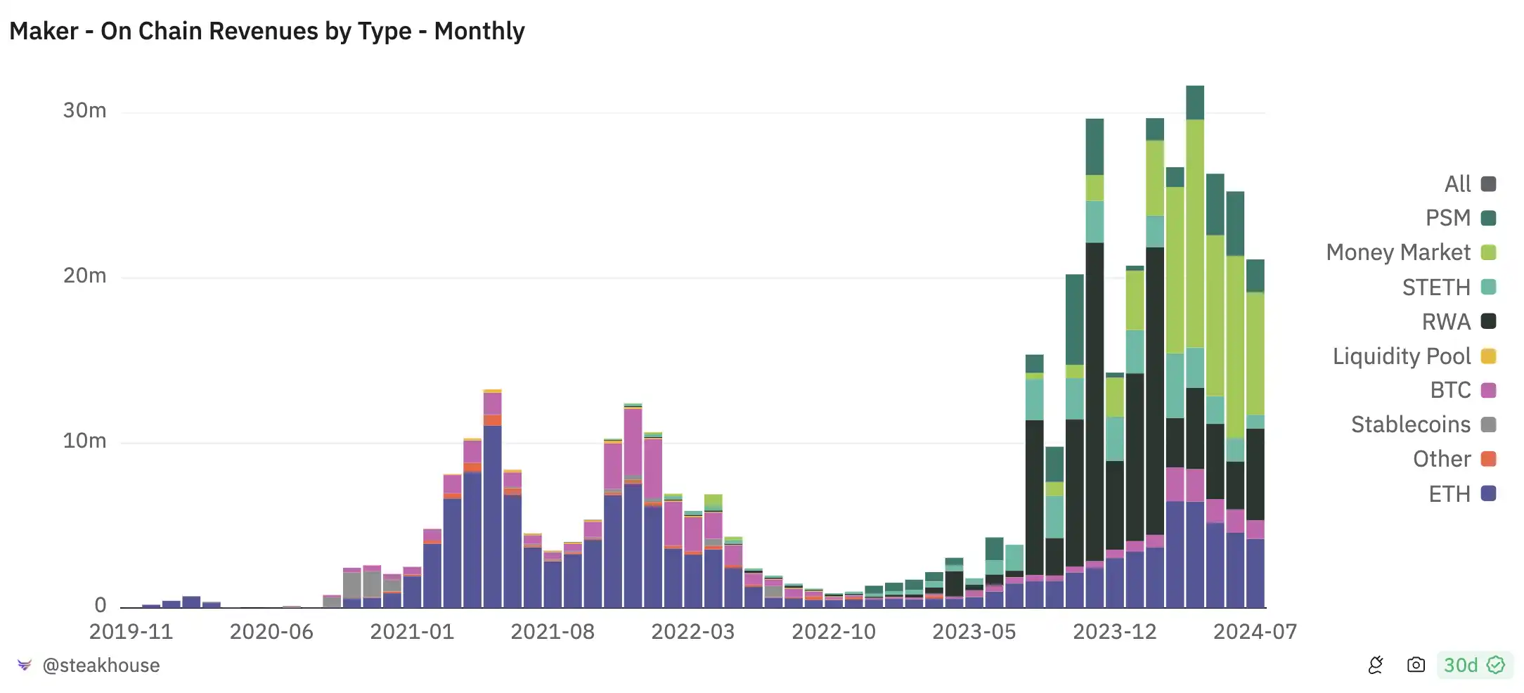 不过,随着 DeFi 项目的补贴降低,甚至 Curve 也推出了自己的稳定币 crvUSD 加入竞争,Maker 不得不寻求新的收入来源。Maker 开始转向 RWA,当美联储开始加息时,MakerDAO 将 PSM 资金转移到链下来获取收益。这一策略使得 Maker 的收入大增,但美联储降息预期越来越强,这种情况或许将不再持续。
