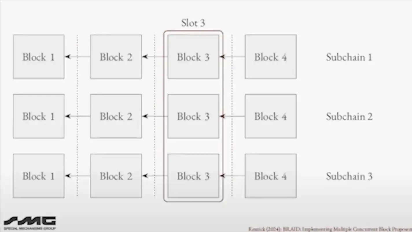 在 Multiplicity 的基础上,Max Resnick 进一步提出了 BRAID,这是一个更加复杂且完善的 MCP 实现。在 Paradigm 举行的主题为「DeFi in MEV Era」的研讨会上,Max 介绍了 BRAID。BRAID 通过允许多个提议者在不同的并行链上提出区块,并利用同步共识机制保持链间一致性,从而实现 MCP。每个链都有自己的提议者,所有提议者在同一 slot 内同时发布他们的区块。以太坊执行层将所有子链在该 slot 内生成的区块交易集合起来,形成一个执行区块,并按照预定的规则对这些交易进行去重、排序并执行,从而降低任何单一实体操纵交易记录的能力。