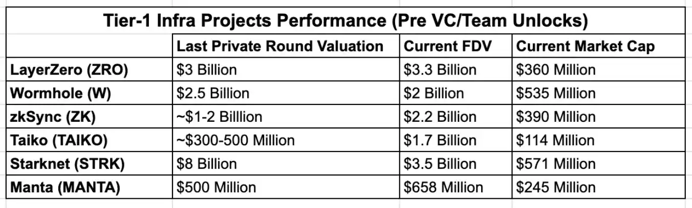 基础设施泡沫已经开始破裂,许多一级基础设施项目在本周期发行的代币已经低于其私募轮估值。随着 6-12 个月内的重大解锁,VC 将陷入困境,这将是变成一场看谁「跑得更快」的竞争。