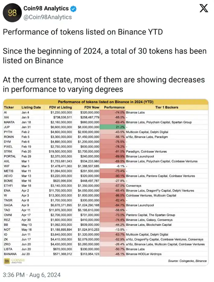 公开市场资本供应不足导致价格发现不佳,今年的代币上市就是明证。高 FDV 发币是 2024 年上半年的一个主要问题。例如,2024 年前六个月发行的所有代币的总 FDV 接近 1000 亿美元,占所有排名前 10 到 100 代币总市值的一半。
