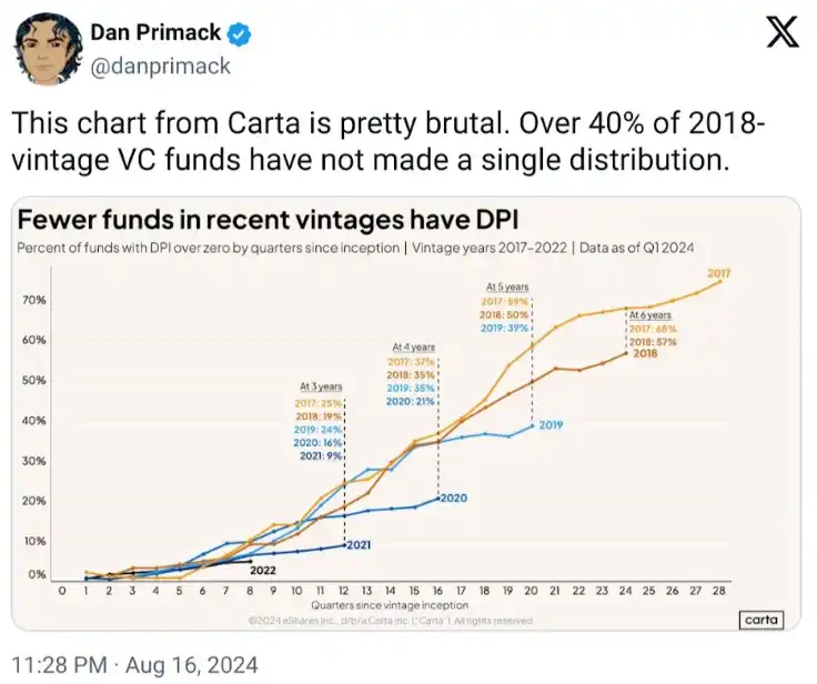 私募风险投资市场已经在萎缩。Haseeb 也承认这一点,这些基金都比之前的基金规模要小,而这肯定是有原因的,不然如果可以的话,Paradigm 会筹集与其前一基金相同的规模。