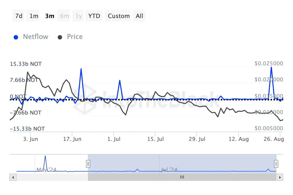 有趣的是,尽管出现这种下降,但 NOT 鲸鱼却利用这种情况增加了他们的积累。在过去七天里,该代币的大持有者的净流量激增了 312%。作为背景,在杜罗夫被捕的消息传出后,这一指标在 8 月 24 日达到了 153.3 亿 NOT 的三个月高点,这导致基于 Telegram 的资产价格暴跌。