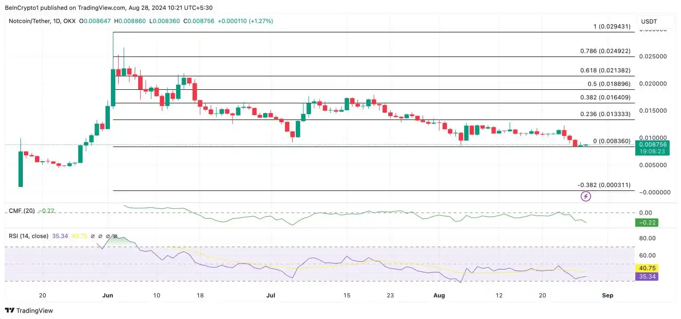 NOT 的技术指标表明该代币的价值可能进一步下跌。Chaikin 资金流 (CMF) 仍处于下降趋势,触及 30 天低点 -0.22。