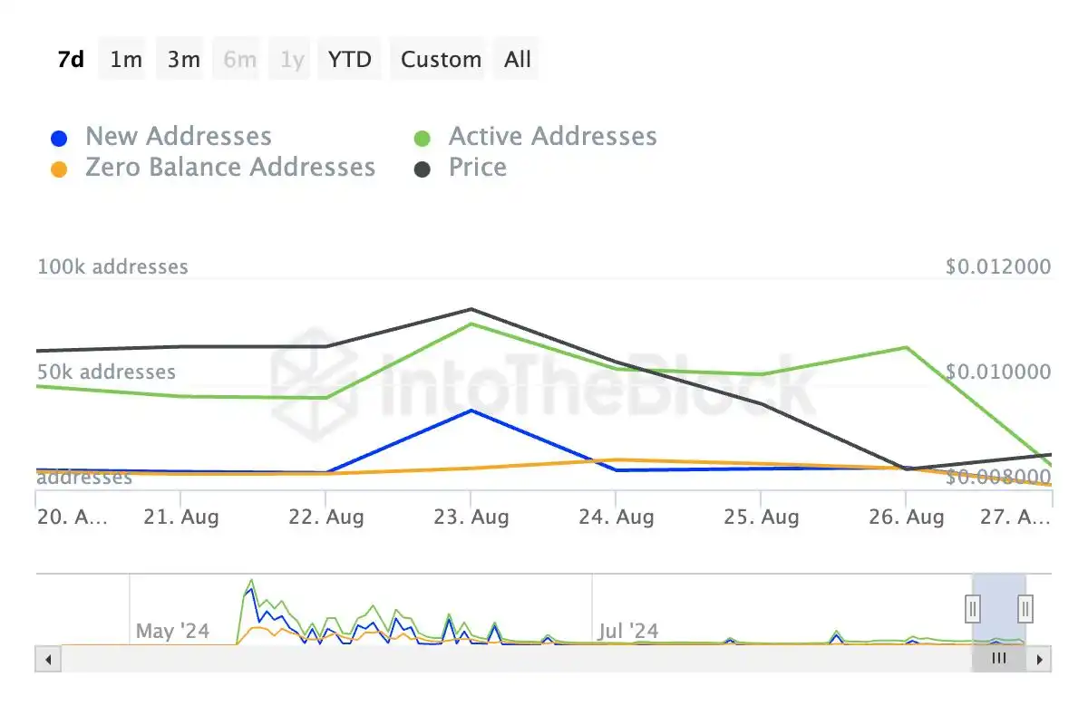 由于 NOT 近期的价格波动,过去七天中交易该竞争币的活跃地址数量持续下降。IntoTheBlock 的数据显示,在此期间完成至少一笔 NOT 交易的唯一地址数量减少了 76%。
