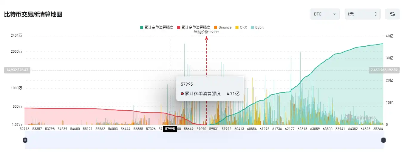 若比特币跌破5.8万美元,主流CEX累计多单清算强度将达4.71亿