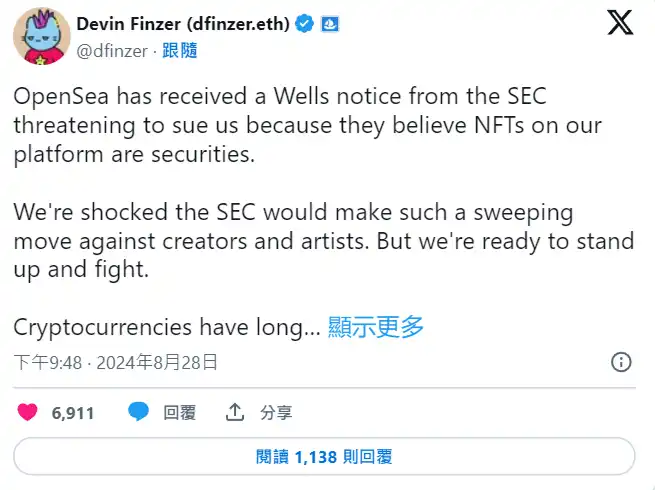 NFT 交易平台 OpenSea 昨(28)晚传出重大利空消息,共同创办人兼执行长 Devin Finzer 在 X 上发文表示该平台已经收到来自美国证券交易委员会 SEC 的威尔斯通知(Wells Notice),SEC 判定 NFT 属于证券,OpenSea 可能将面临法律诉讼: