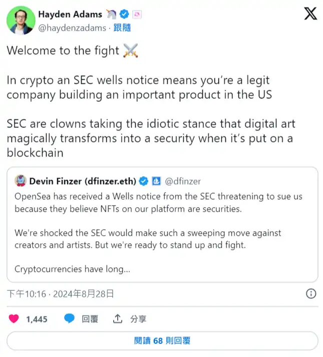 作为以太坊上最大的去中心化交易所(DEX),Uniswap 在今年 4 月同样收到了来自 SEC 的威尔斯通知,当 OpenSea 遭到同样待遇后,Uniswap 执行长 Hayden Adams 昨晚也在推特上发声支援,称 SEC 是愚蠢的,欢迎 OpenSea 一起加入对抗 SEC 的战斗:
