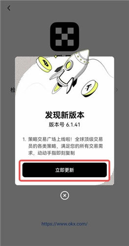 1、欧e虚拟货币交易平台新版本上线后,会在首页弹窗通知,您可以点击弹窗中的【立即更新】,下载安装最新版本。