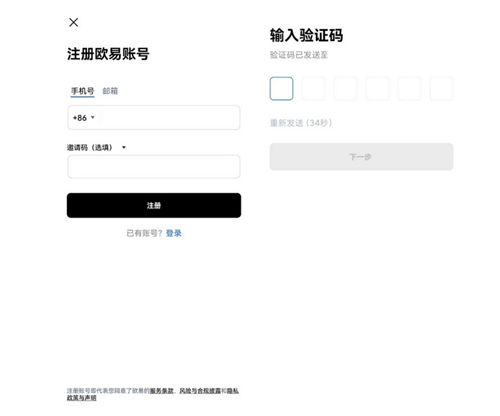 1、打开欧e虚拟货币交易平台,点击“注册账号”;注册分为手机号注册和邮箱注册两种方式,您可以自由选择注册类型,然后按照要求填写完整相应信息即可完成注册。
