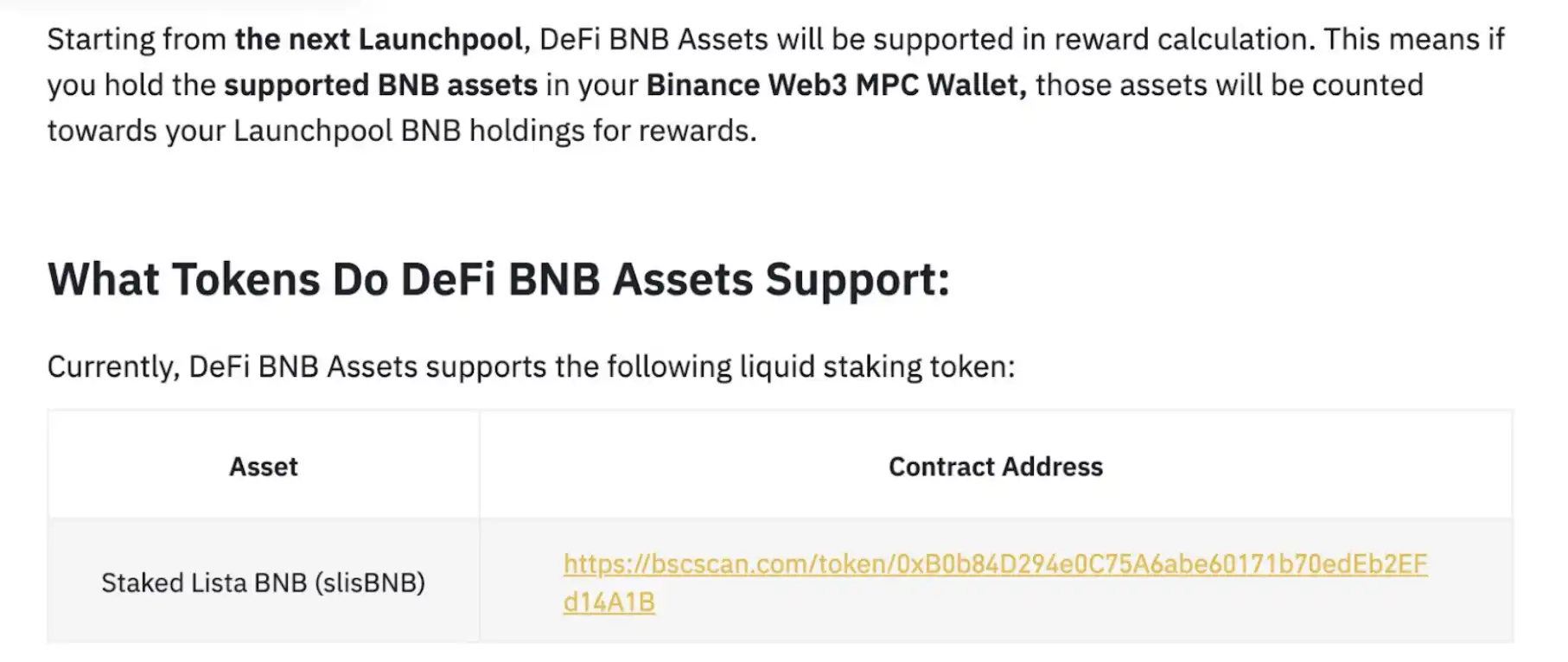 如果用户在 Binance Web3 MPC 钱包中持有 slisBNB,那么将自动计入 Launchpool BNB 持仓量,以获得奖励。除了 Launchpool 平台之外,Megadrop 和 HODLer 空投也将支持去中心化 BNB 资产。