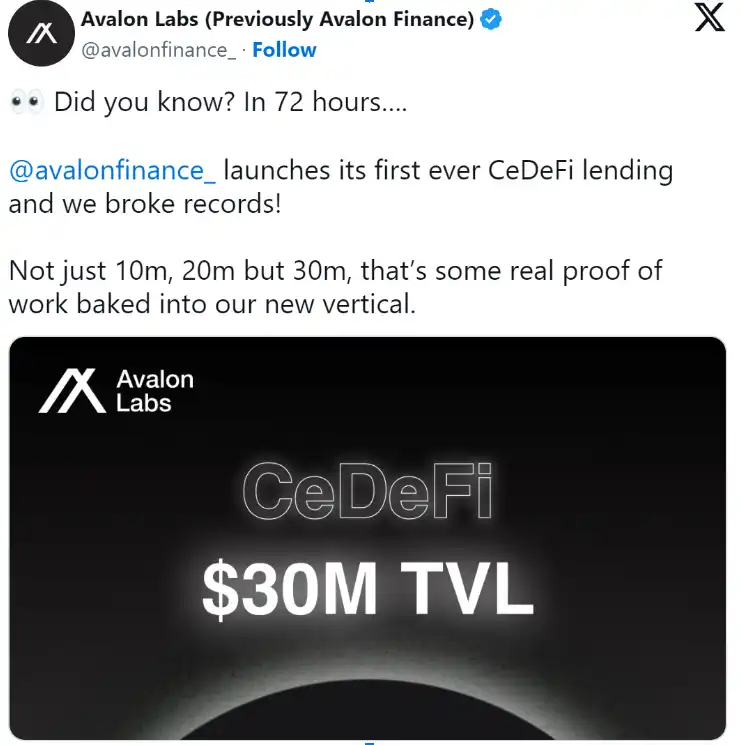 今天我们来了解一个通过其创新的 CeDeFi 平台在金融领域实现正和博弈的项目 Avalon Labs。Avalon Labs 是 CeDeFi 和 BTC LSDFi 借贷的领先市场,并且致力于成为 BTC 生态系统中最好的借贷平台,并已部署在多个主流区块链网络上,如 Arbitrum、BNB Chain、Bitlayer、CoreDAO、Ethereum 和 Merlin。