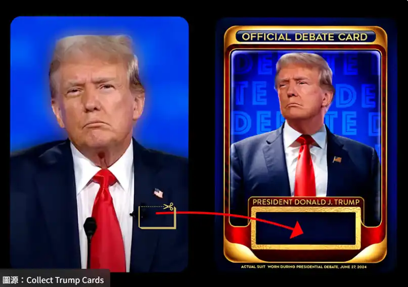此次 NFT 发行的亮点之一是,收藏者如果购买 15 张卡片(价值 1,485 美元),将获得一张实体卡片,该卡片内含他在辩论中穿著的西装的一部分。