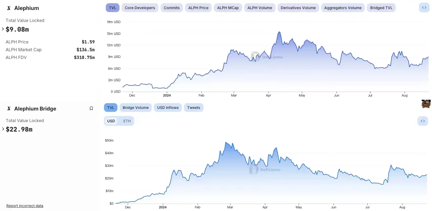 2023 年 11 月,Alephium 发布了桥接功能,这为 Alephium 的生态系统引入了稳定币,从而将稳定币桥接到 Alephium。另外,用户还可以将 ALPH 桥接到以太坊,并在 Uniswap 上交易,这使得 Alephium 交易量的爆炸性增长。目前,Alephium 已执行 3060 万美元交易,拥有 908 万美元 TVL,以及 2298 万美元桥接 TVL。