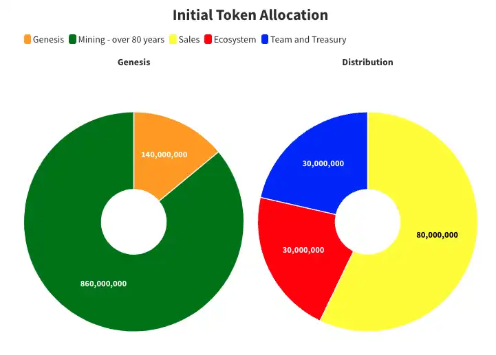 Alephium 的原生代币为 ALPH,最大供应量为 10 亿。其中 86%,即 8.6 亿枚 ALPH 将在约 82 年内被开采(从 2021 年主网启动开始)。剩余的 1.4 亿枚 ALPH 用于生态系统、销售、团队和财务分配。