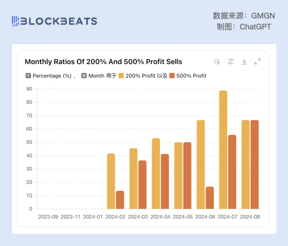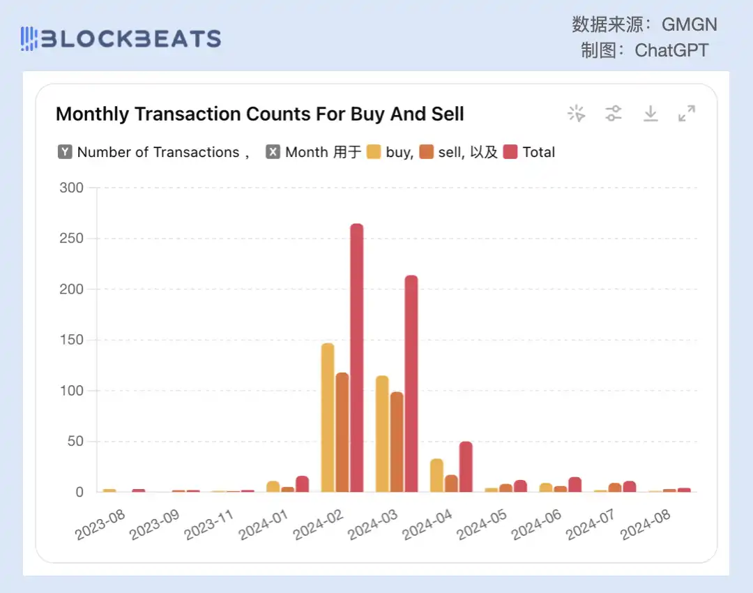这种冷静,不仅让他在后续的几个月行情震荡中始终没有出现大额的损失,而且交易胜率还出现了上涨的趋势。不过值得注意的是,我所有对他盈利的分析都是基于卖出交易。如果它买了之后归零了没有卖,我这边就是统计不到的,所以对于他胜率的分析是存在局限的,他的实际胜率可能并没有这么高。